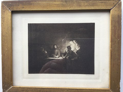 Efter maleri af Rembrandt van Rijn's værksted 1648. Maleriet er ophængt på Statens Museum for Kunst i København og i mange åre troede man det var en ægte Rembrandt.
