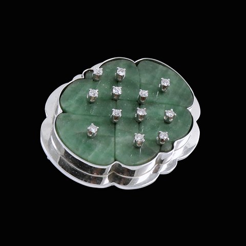 Broche i 14k hvidguld med jade og 12 diamanter. Total 0,24 ct. |
