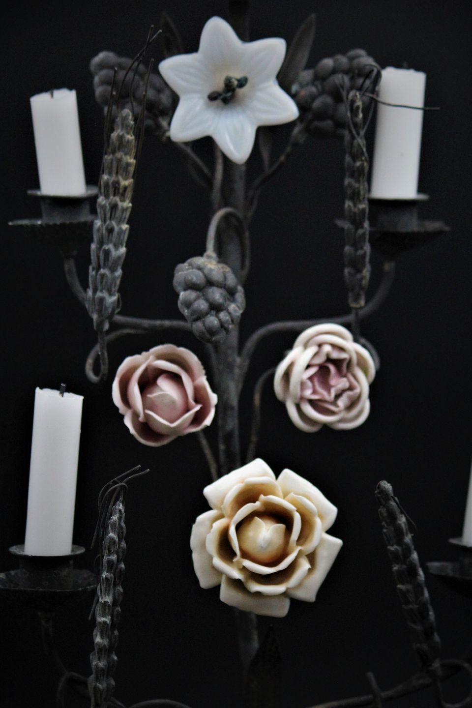 Fransk 1800 tals lysestage i mørk patineret bronze , dekoreret med 3 gamle farvet porcelæns blomster og 1 hvid opal glas blomst.