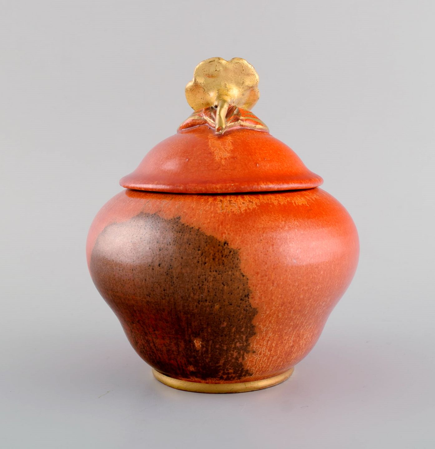 Nils Emil Lundström (1865-1960) for Rörstrand. Antik lågkrukke i glaseret keramik. Smuk orange glasur og blomst i guld på laget. Start 1900-tallet.