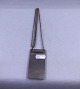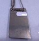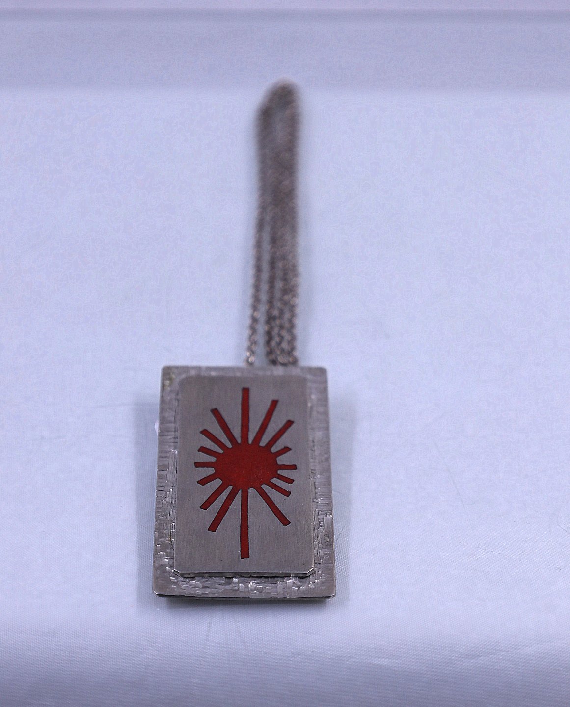 Pewter, halssmykke i tin. Halssmykket er en kæde med rektangulært vedhæng. Vedhænget er af tin med emaljeret rød sol. Kæden er fast og af tin. Stemplet Pewter, Made in Denmark.