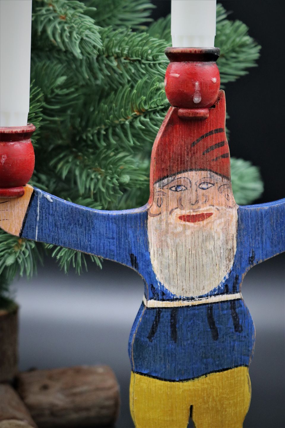 Gammel svensk julenisse lysestage i udskåret træ fra 50érne , bemalet med en fin patina.