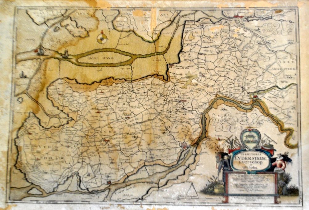 Håndkoloreret landkort over Ejderstedt området i Nordtyskland. 1648