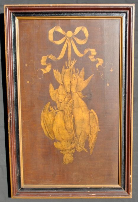 Painted panel with birds from Svane Apoteket, 19th century Vestergade 4, Aarhus, Denmark. Oil on pine. 85 x 52 cm.
