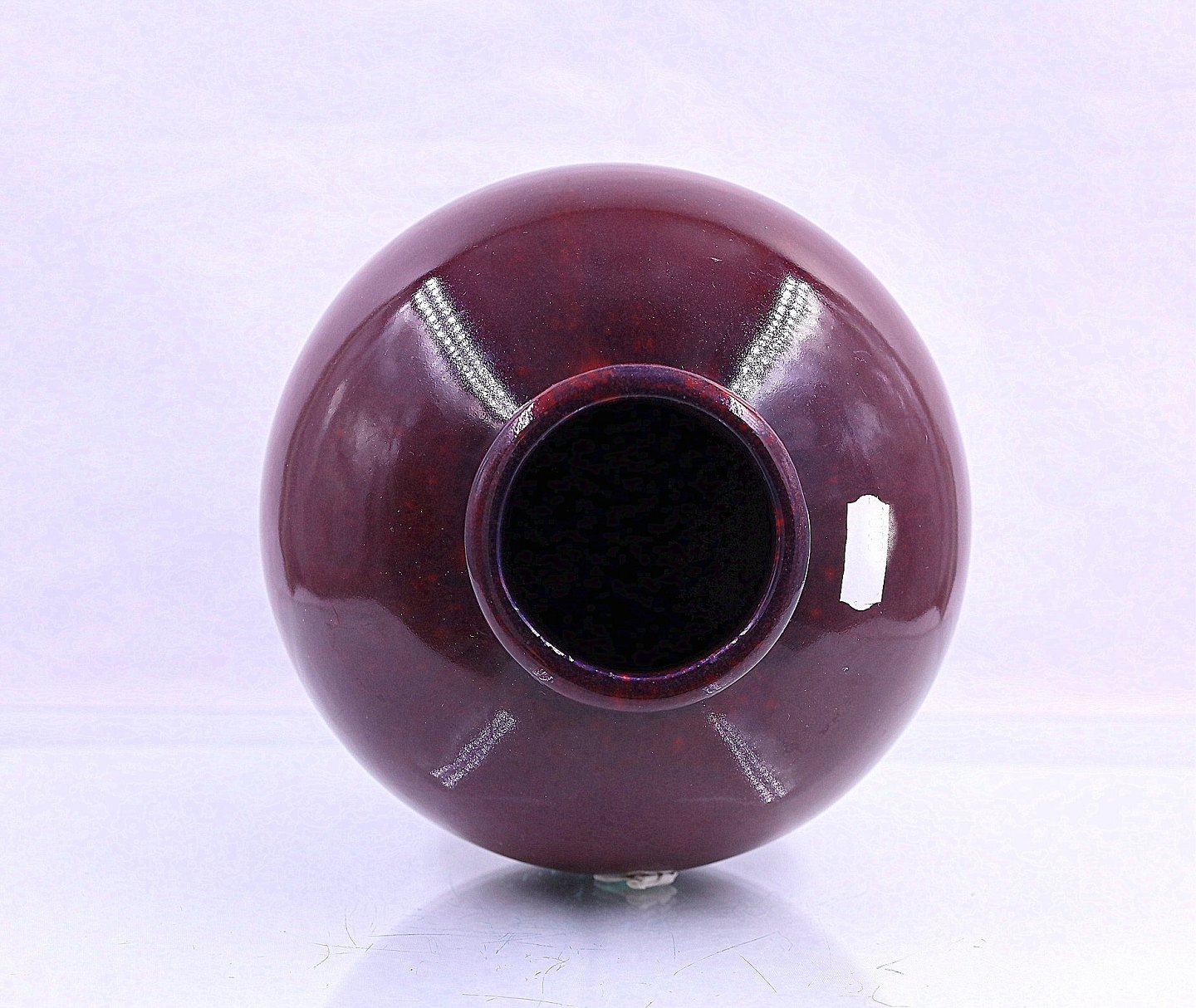 Keramik vase, der er glaseret okseblodsrød. Vasens facon er kuglerund.