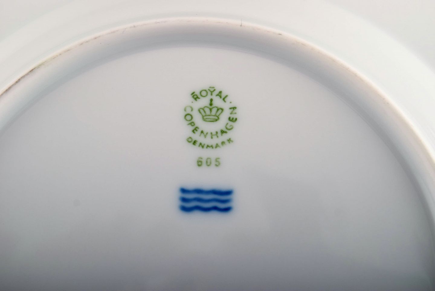 Fire Royal Copenhagen Hvid Rose dybe tallerkener med blå kant, hvide blomster og bladværk. Dateret 1992-1999.