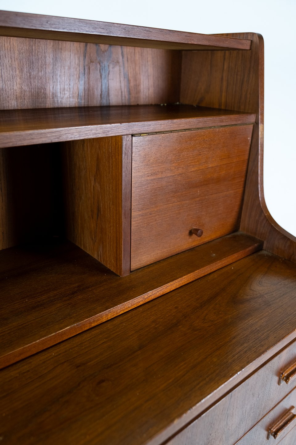 Denne sekretær, designet og produceret i Danmark omkring 1960'erne, er et smukt eksempel på dansk møbelkunst fra denne æra. Fremstillet af teaktræ, udstråler sekretæren en varm og naturlig elegance.