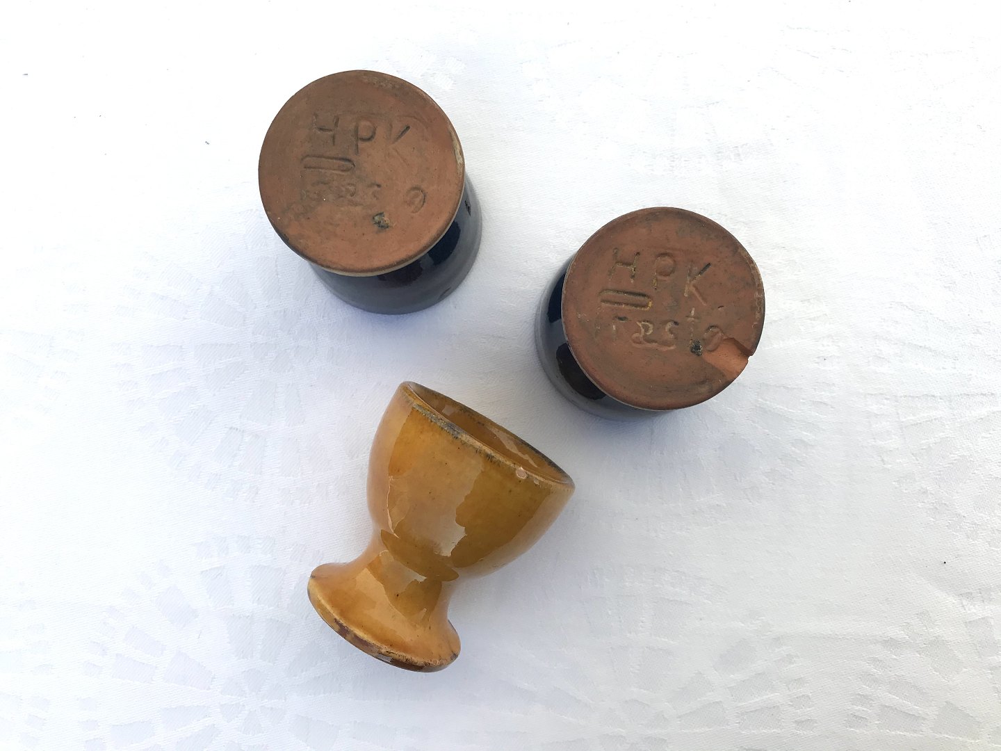 Rødeled keramik, HPK, Hans Peter Knudasen, Præstø, Æggebæger, 2blå, 1gul, 4,7cm i diameter, 5,5cm høj *Pæn stand med lidt skrammer*