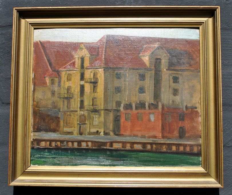 Hou, Hans Axel (1860 - 1948) Dänemark: Lagerhaus Christianshavn, København. Öl auf Leinwand / Pappe. 23 x 28 cm. Auf der Rückseite gestempelt von der Künstler-Nachlassauktion in Kopenhagen in den Kunsthallen 1948 als Nr. 175.