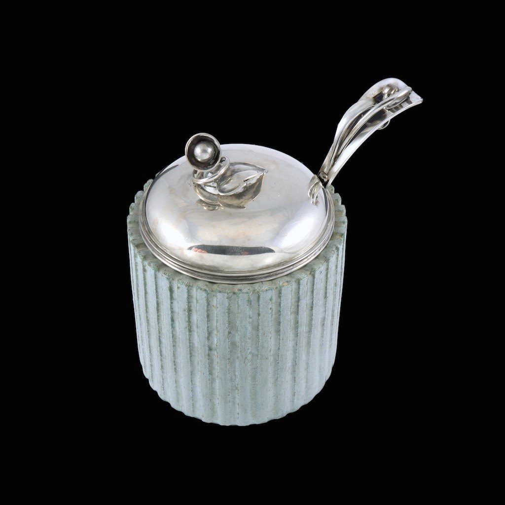 Arne Bang - Carl M. Cohr. Krukke i stentøj med låg samt ske i sølv.