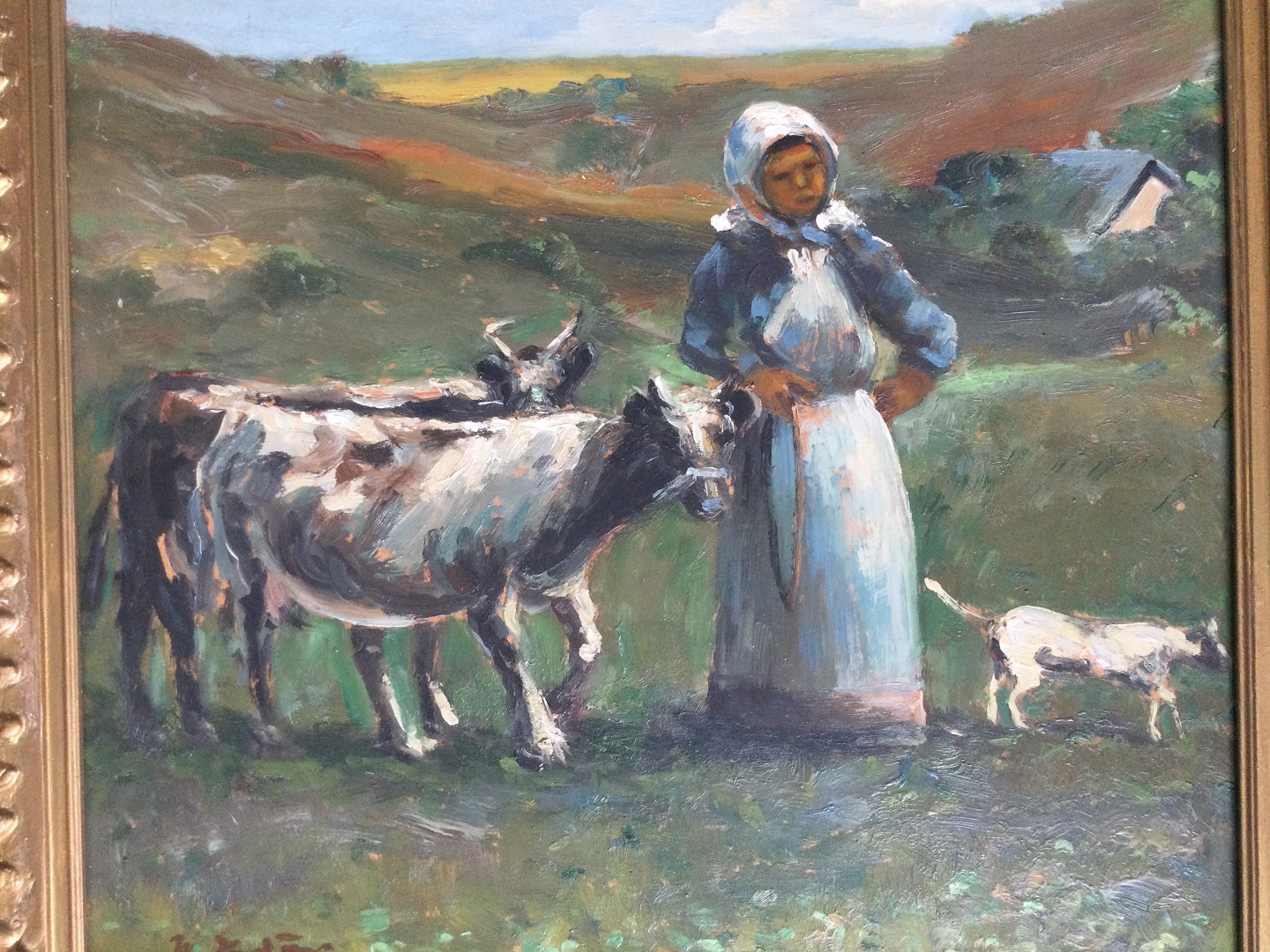 Maleri - Aksel Lundgreen - Bondekone på marken med kalve.