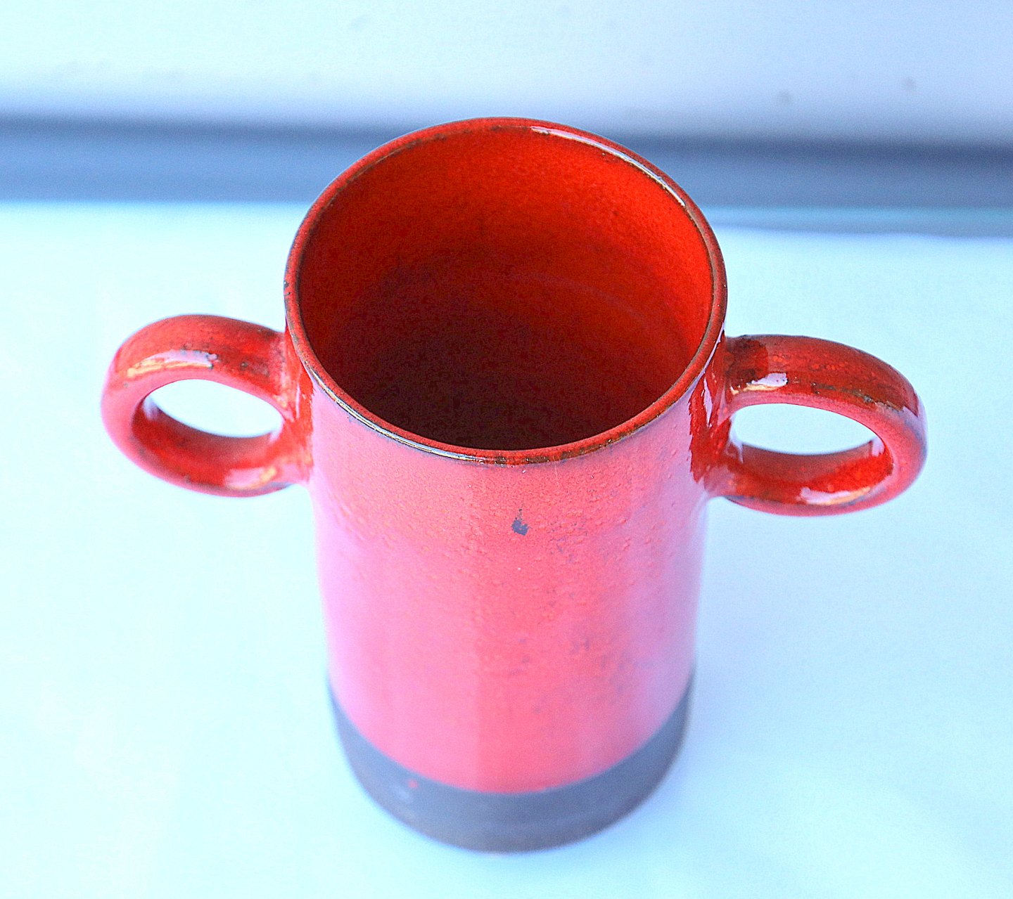 Abbednæs Potteri, krus med 2 runde hanke. Keramik, rød glaseret, krus med 2 røde hanke.