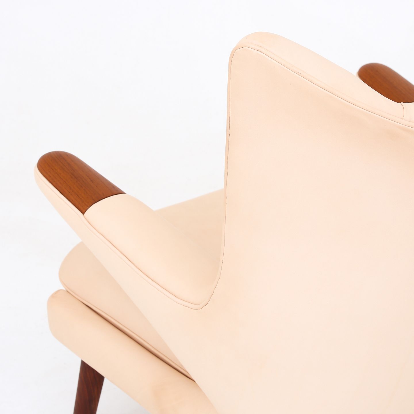 AP 19 - Nybetrukket Bamsestol i vegetal-læder/naturlæder med mørke ben og poter. KLASSIK tilbyder polstring af Bamsestolen med stof eller læder efter eget valg. Kontakt os venligst for mere information.