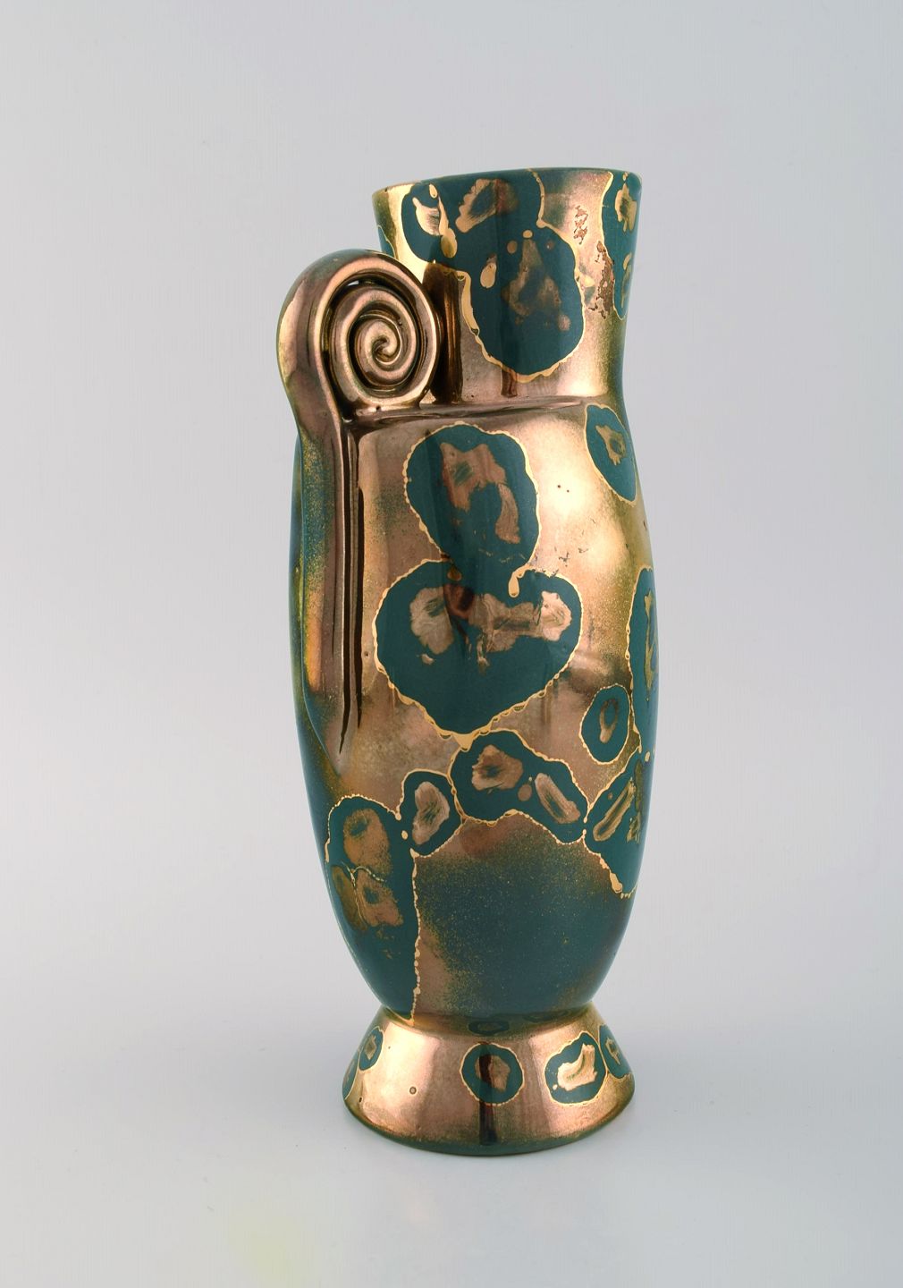 Arts Ceram Grand Feu, Frankrig. Vase / kande i glaseret stentøj. Smuk glasur i guld og grønne nuancer. 1920'erne.