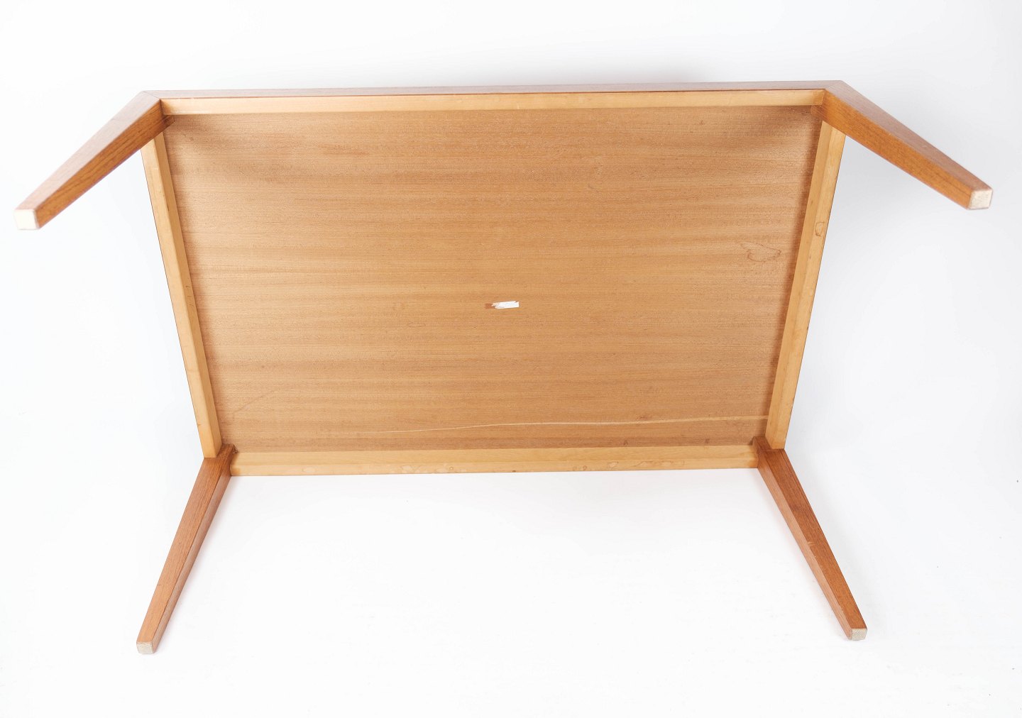 Dateret til 1960'erne bærer dette sofabord præg af den æra, det blev skabt i, samtidig med at det stadig er i god stand. Med sit smukke teaktræ og karakteristiske design vil dette sofabord være et centralt og stilfuldt element i enhver stue, hvor det tilføjer både skønhed og funktionalitet.