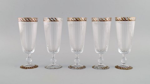Nason & Moretti, Murano. Five wine glasses in mouth-blown art glass with hand-painted turquoise and gold decoration. 1930s.