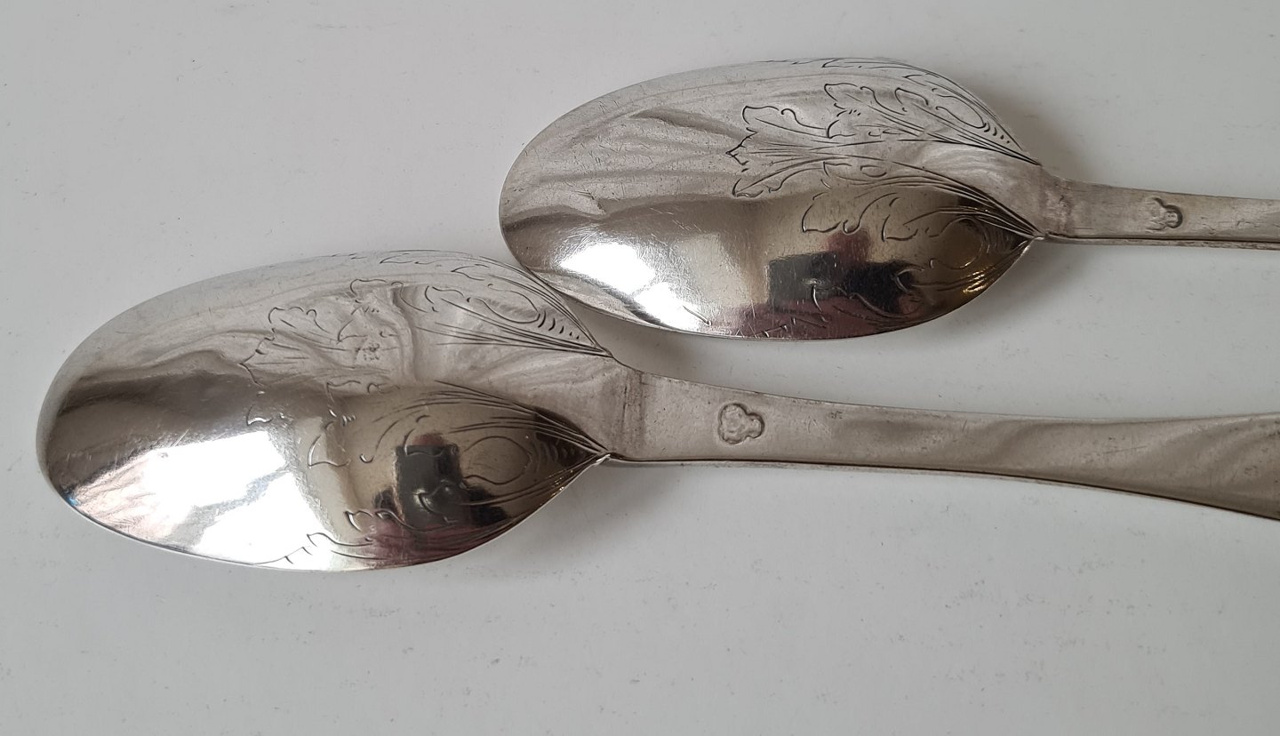 Par 1700 tals brudeskeer i sølv graveret med ejerinitialer samt årstal 1743