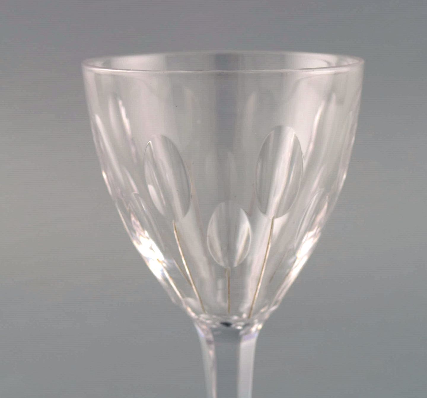 Baccarat, Frankrig. Seks glas i klart mundblæst krystalglas. Midt 1900-tallet.