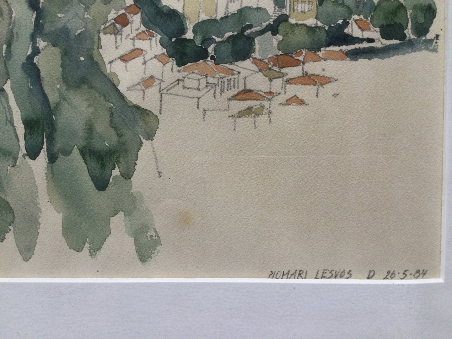 Akvarel af Hans Bendix Pedersen - Parti fra Plomari, Lesbos, Grækenland 1984.
