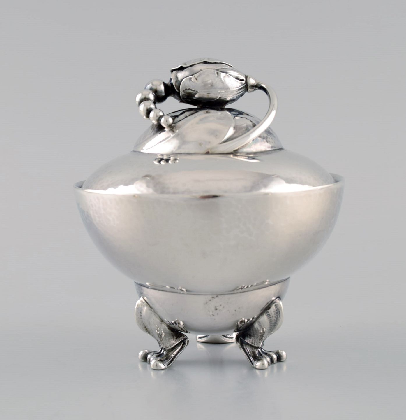 Georg Jensen Magnolia sukkerskål i hammerslået sterlingsølv. Model 2D. Dateret 1925-1932.