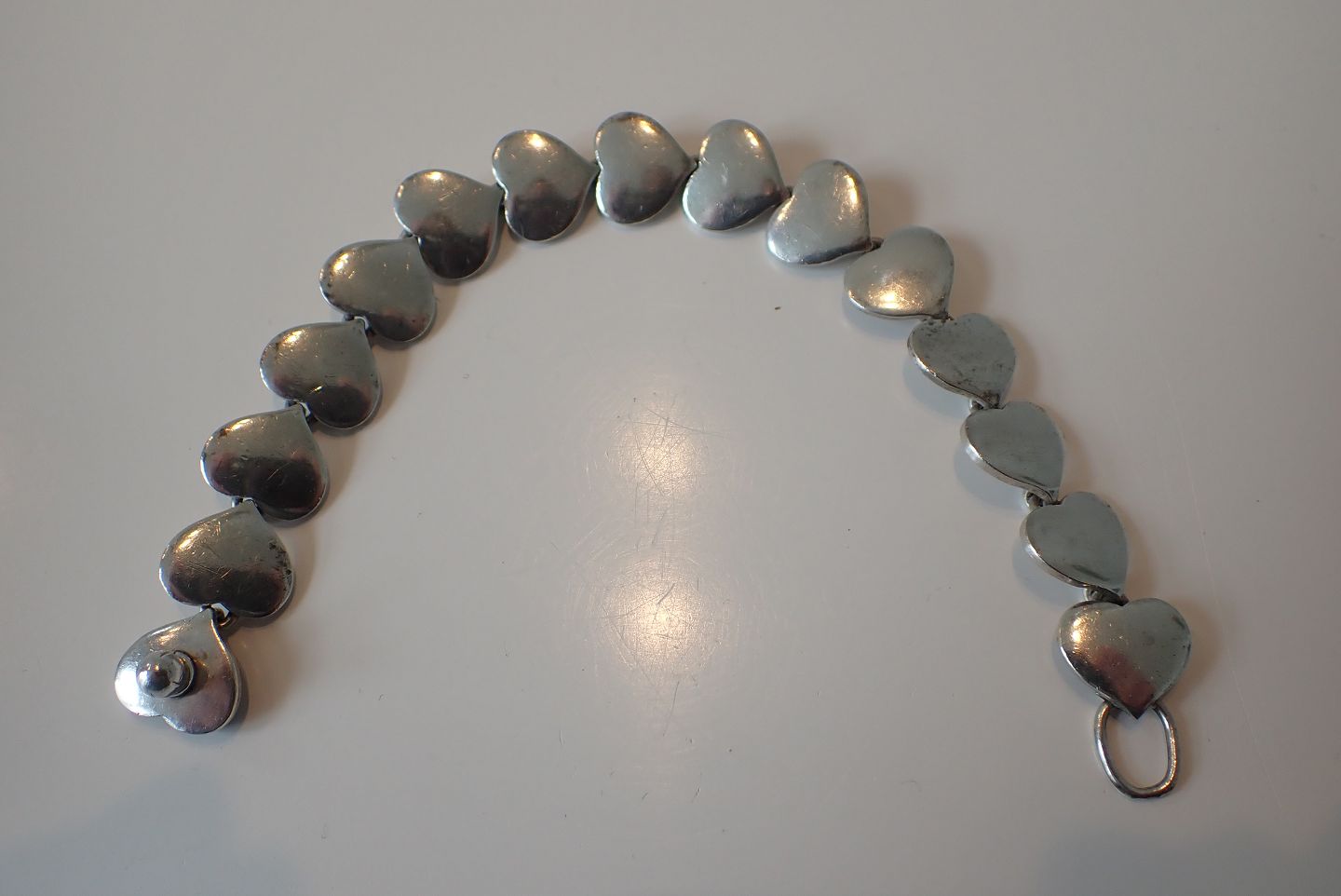 Hans Hansen sølvsmedie(1884 - 1982), hjertearmbånd designet af Karl Gustav Hansen (1914 - 2002) i sterling sølv: Vægt: 27,2 gram. Stemplet monogram fra perioden 1937 - 1947: HaH. 925s. Skruelukke. Længde: 18 cm. Hjertebredde: 0,9 cm. I pæn brugt stand.