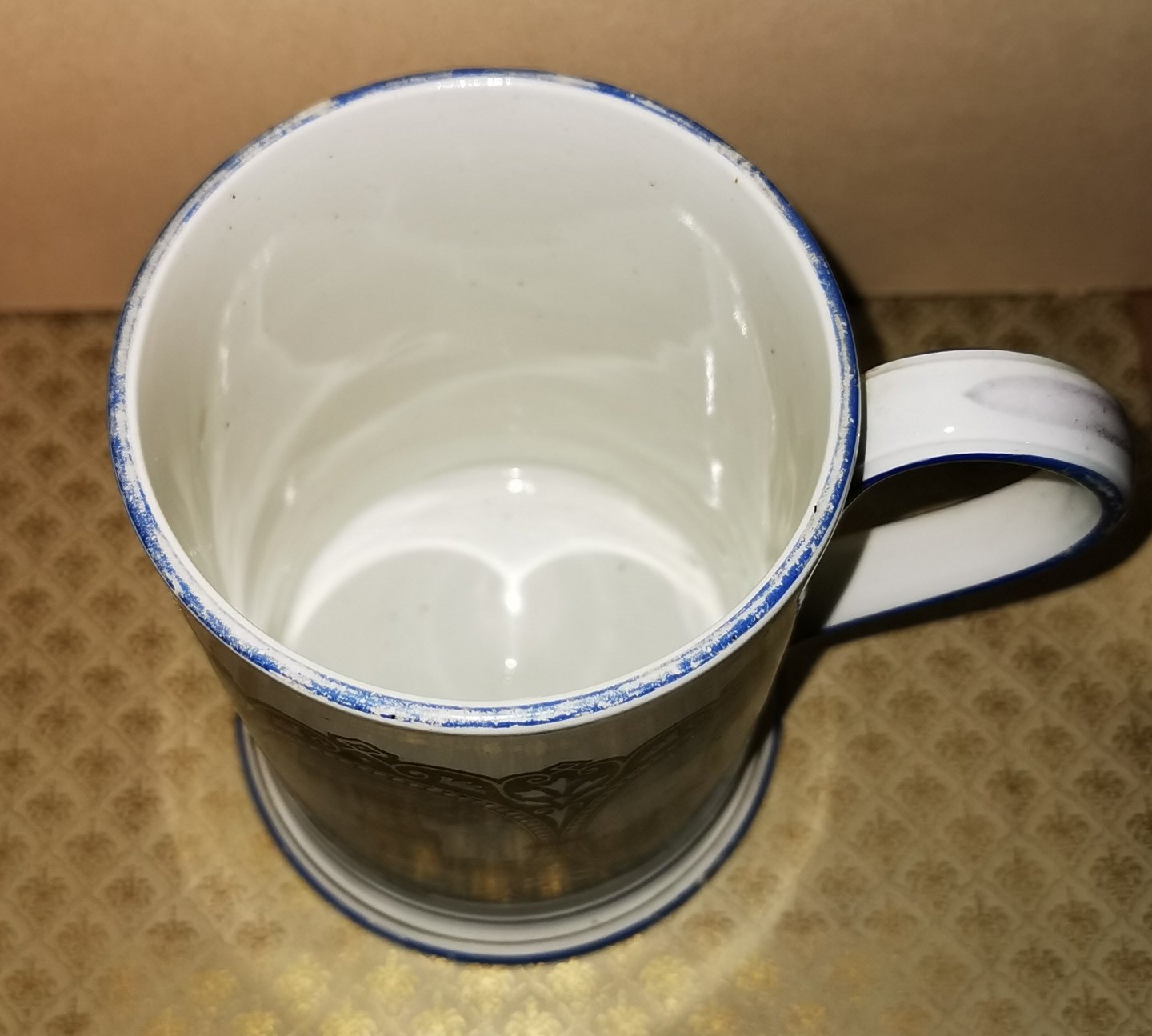Hankekrus i fajance fra Aluminia fabrikken fra slutningen af 19. århundrede. Dekoreret med farverige motiver fra Købehavn. I god stand uden skader eller reparationer. Almindeligt brugsslid. Fabriksmærket på bunden. Mål: H. 13½-½4 cm. Toppens diameter 9½ cm og bundens diameter 11 cm.