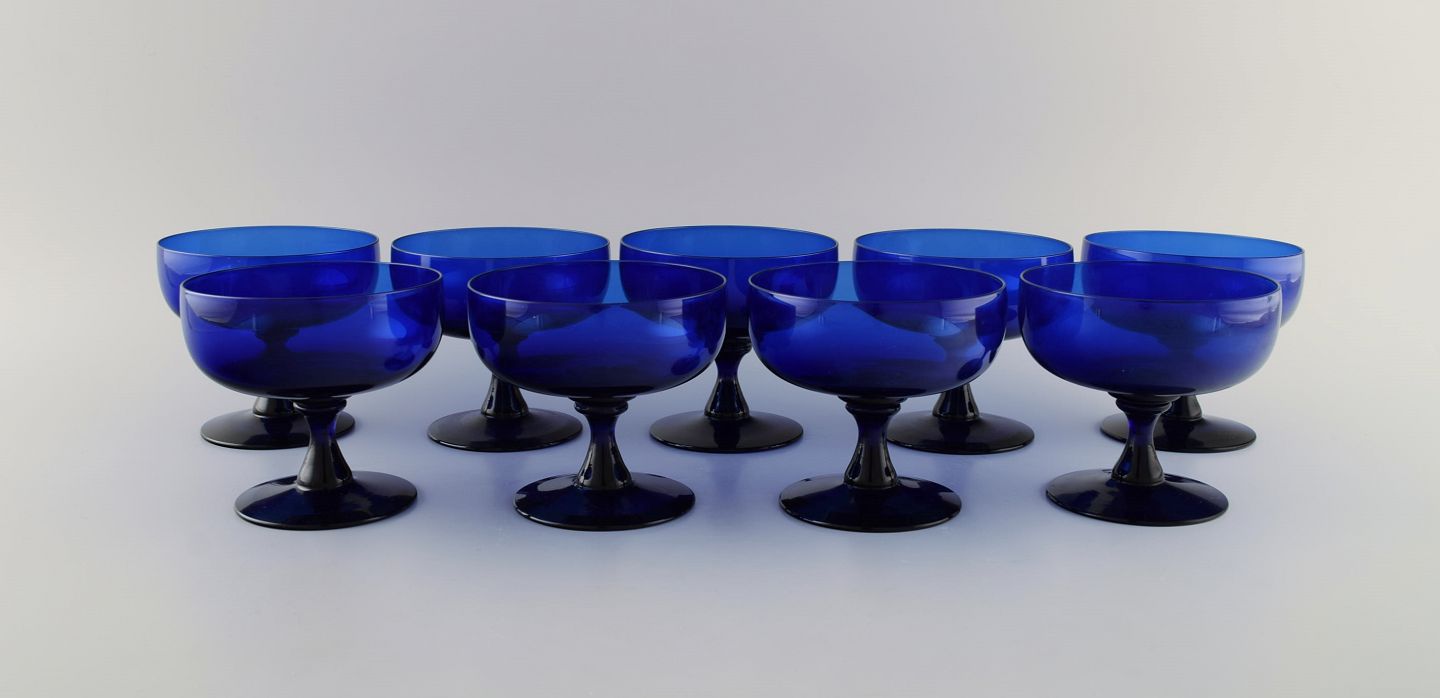 Monica Bratt for Reijmyre. 9 glas i blåt mundblæst kunstglas. Svensk design, midt 1900-tallet.
