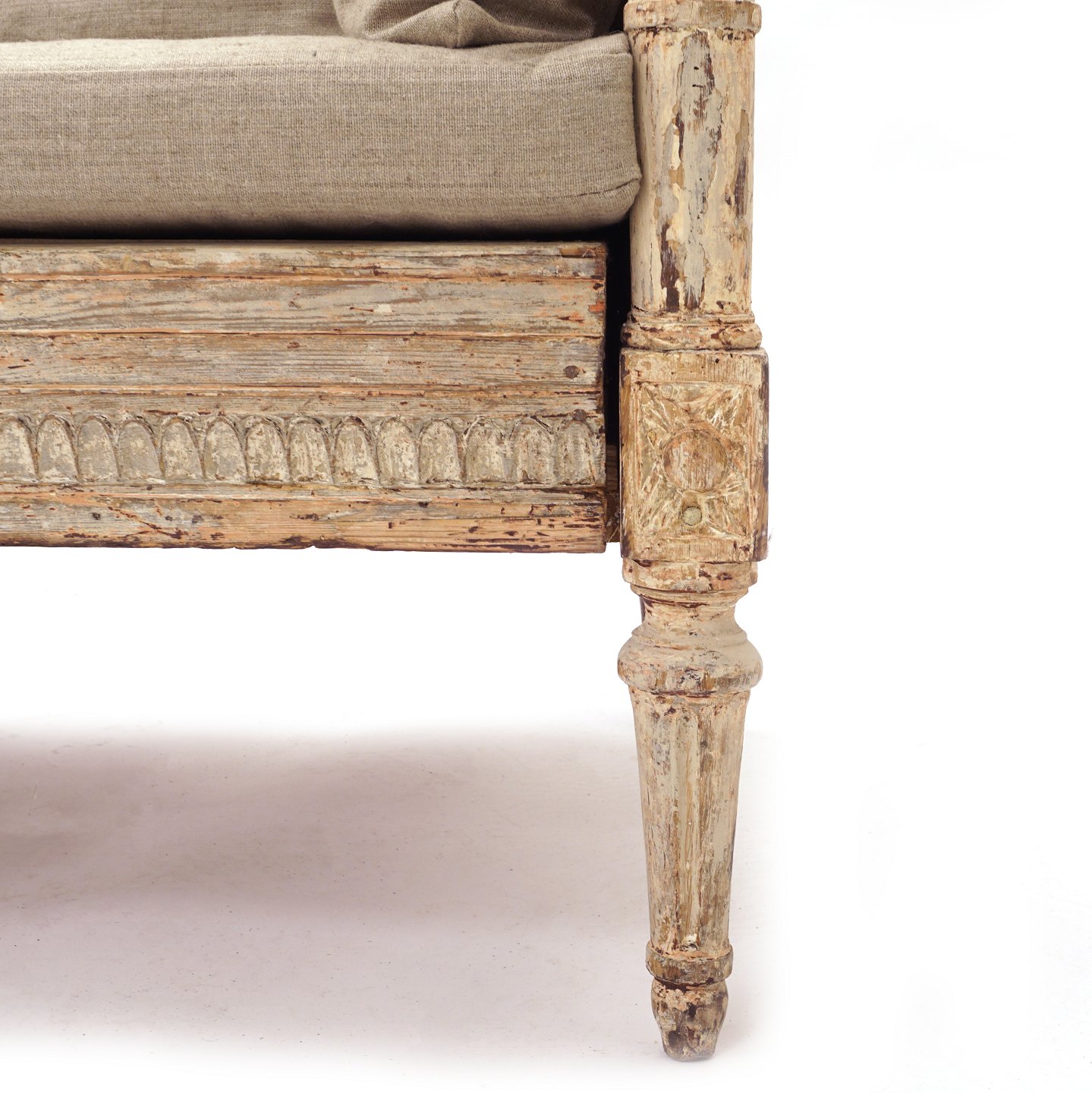Sengustaviansk sofabænk i lyse grå farver. Sverige ca. år 1800. L: 190cm. D: 63cm. H r: 116cm. H s: 44cm