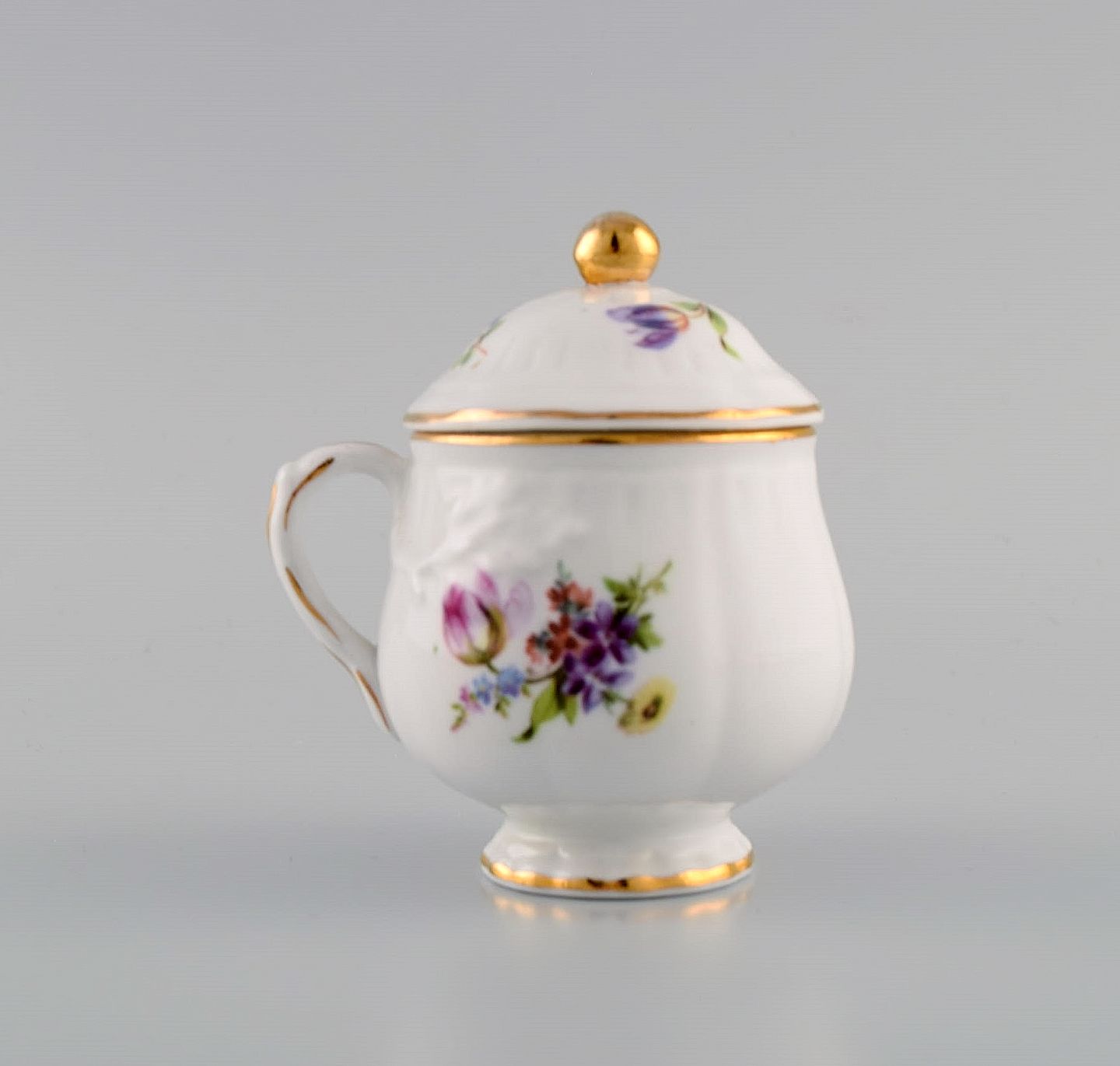 10 antikke Rörstrand cremekopper i porcelæn med håndmalede blomster og gulddekoration. Ca. 1900.