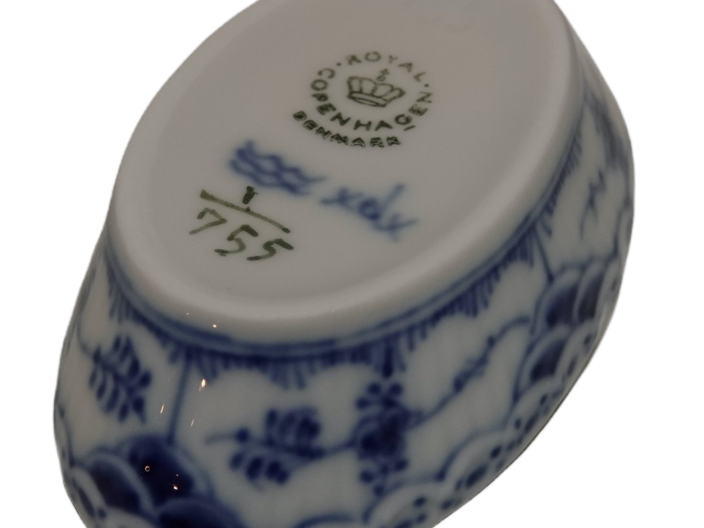 Royal Copenhagen Musselmalet Halvblonde, ovalt saltkar.