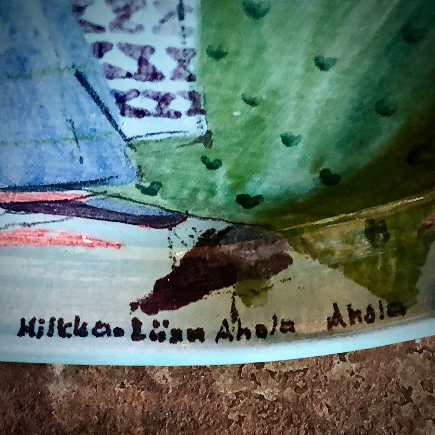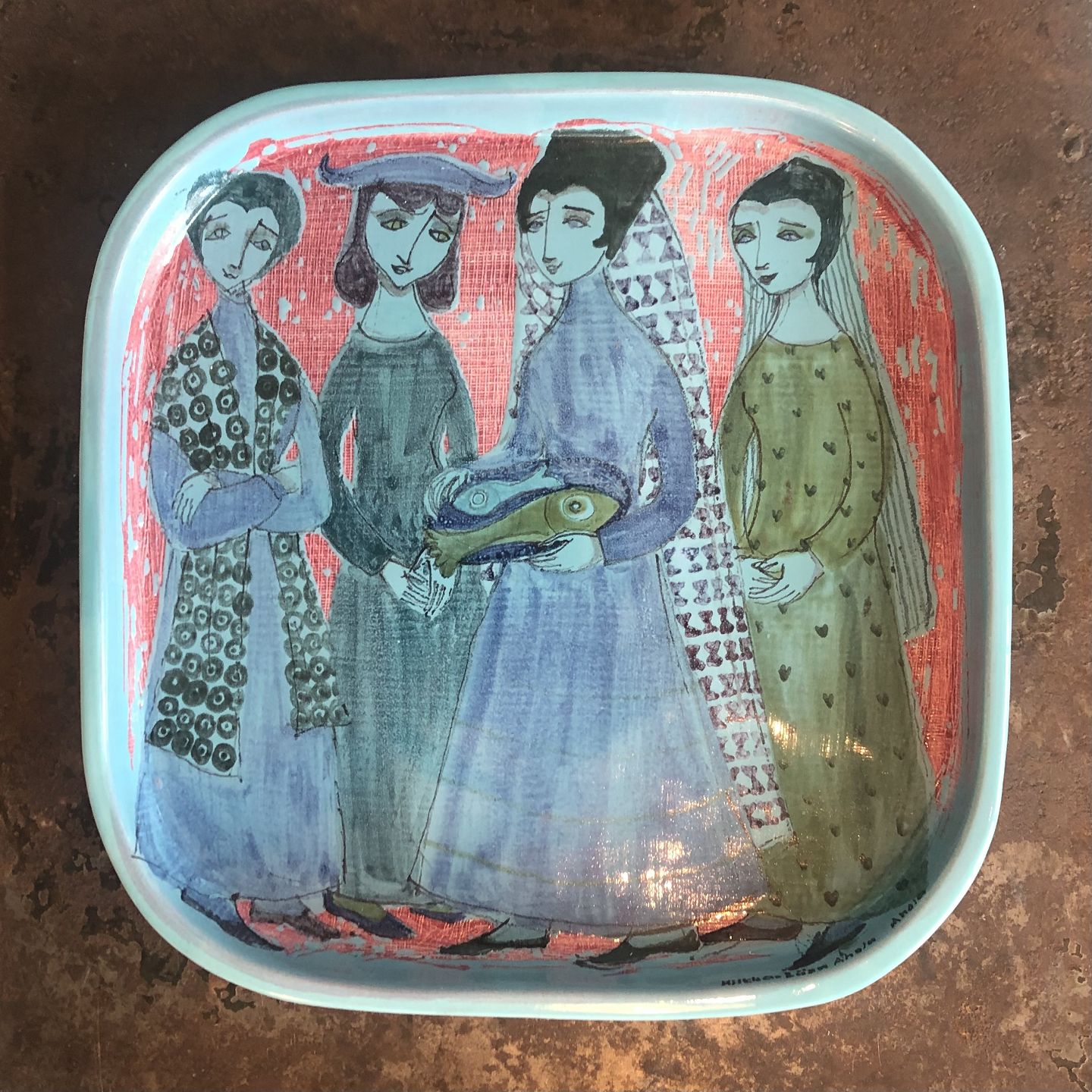 Hilkka-Liisa Ahola, Stort fajancefad Arabia. Turkis glasur med motiv af kivinder med Fisk. Signeret Hikka Liisa Ahola. H. 3 cm. 30 x 30 cm. God stand.
