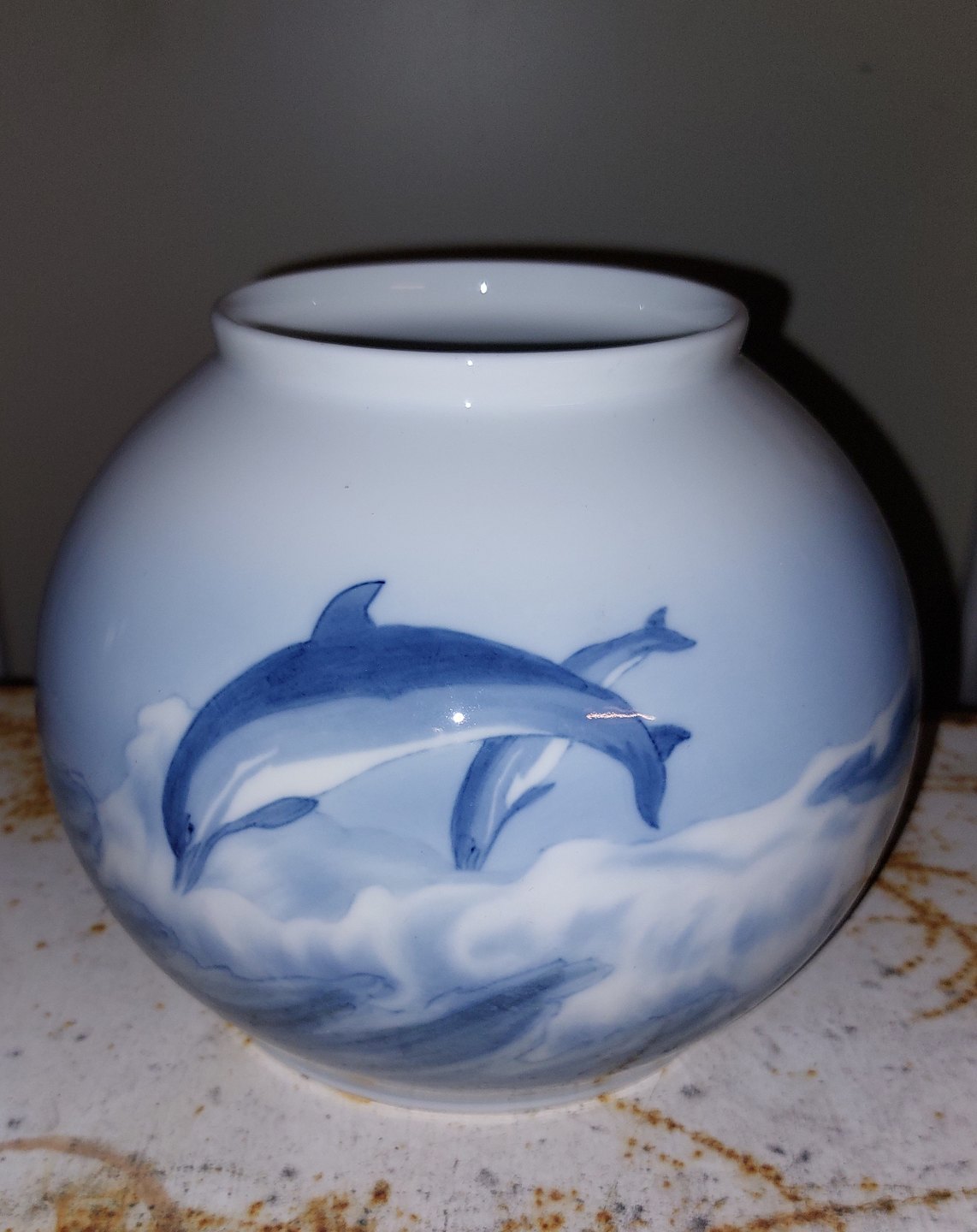 Rund art nouveau vase i porcelæn fra den norske porcelænsfabrik Porsgrund. Designet af Thorolf Holmboe. Dekoreret med delfiner. Fremstår i perfekt stand uden skader eller reparationer. Fremstillet i begyndelsen af 20. århundrede. Fabriksmærket på bunden sammen med kunstnersignatur. Mål: 16½ cm (6.49 inches) samt diameter midt på vasen på 19 cm (7.48 inches)