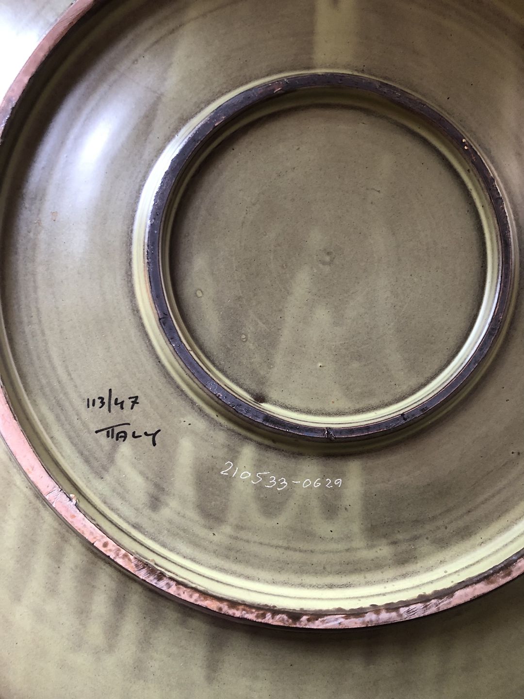 Stort fad i grøn glaseret stentøj udført hos Aldo Londi Italien.