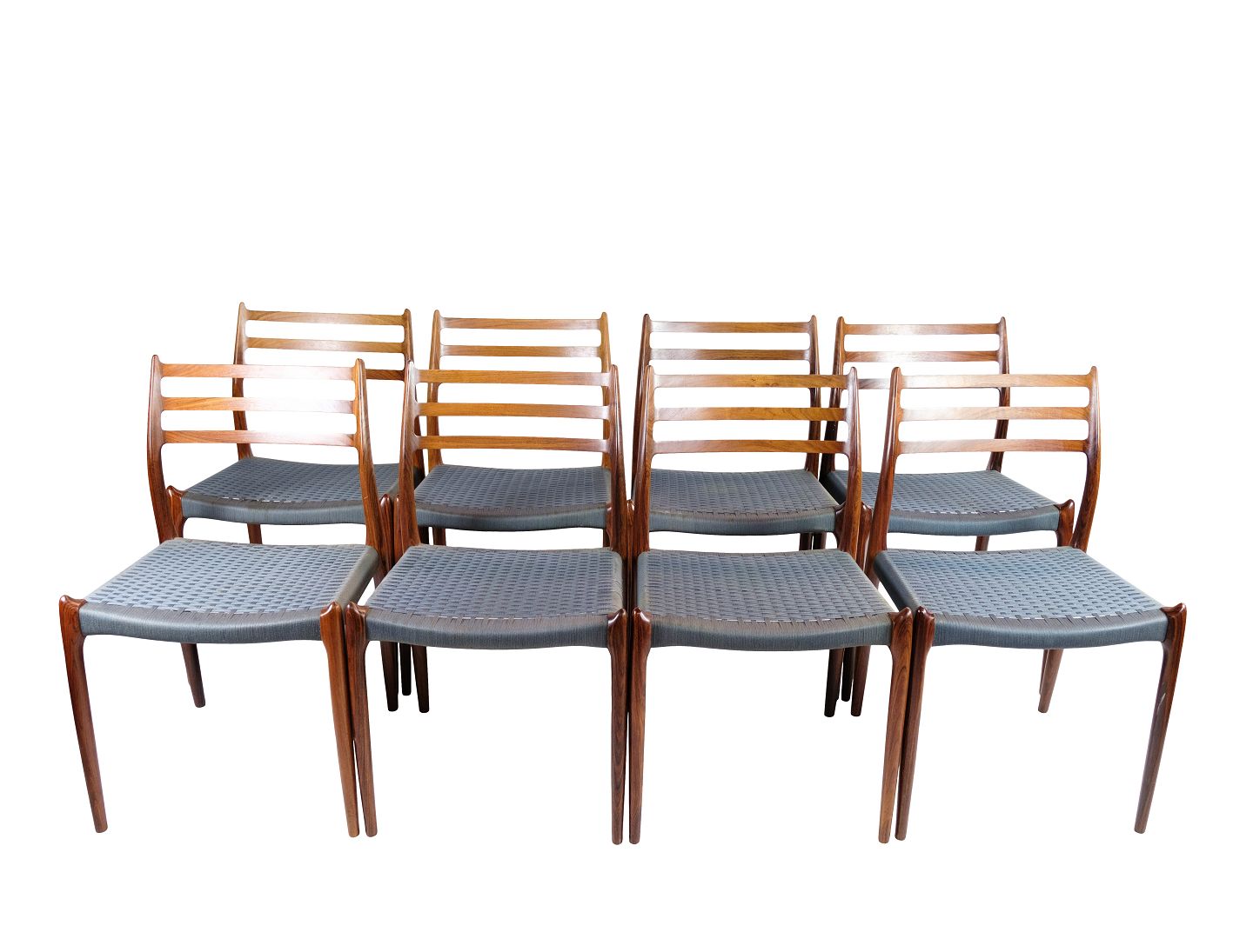 Sæt af 8 spisestuestole, model NO 78, designet af N.O Møller og fremstillet af J. L. Møller Møbelfabrik fra omkring 1960'erne. Stolene er i palisander med blåt flet. På vores eget værksted kan vi flette stolene eller betrækker med læder for en merpris. Skriv en mail til os og vi finder ud af det sammen. Info@osted-antik.dk