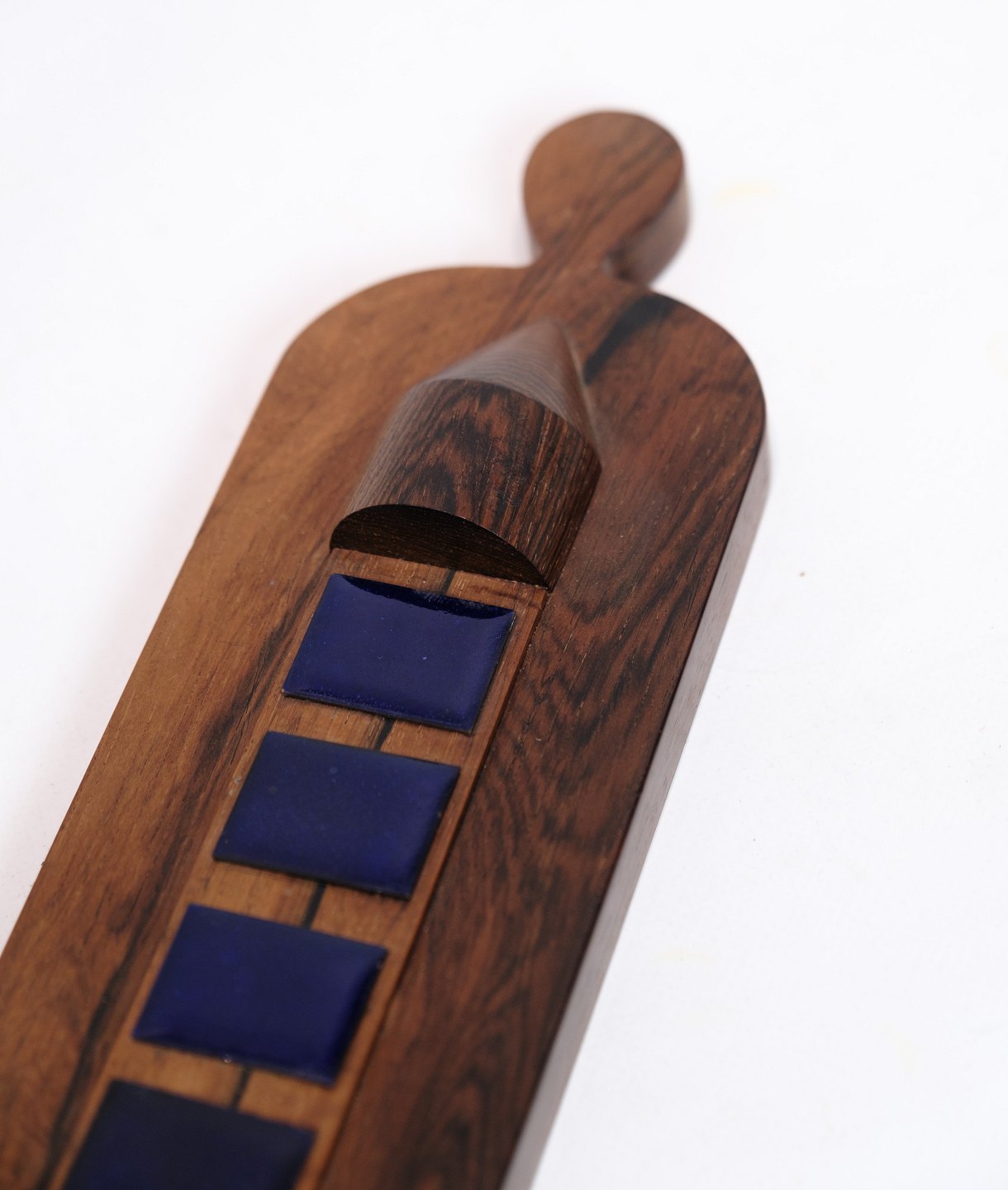 Væglysestage i træsorten palisander med indlæg i blålige farver fra omkring år 1960'erne.