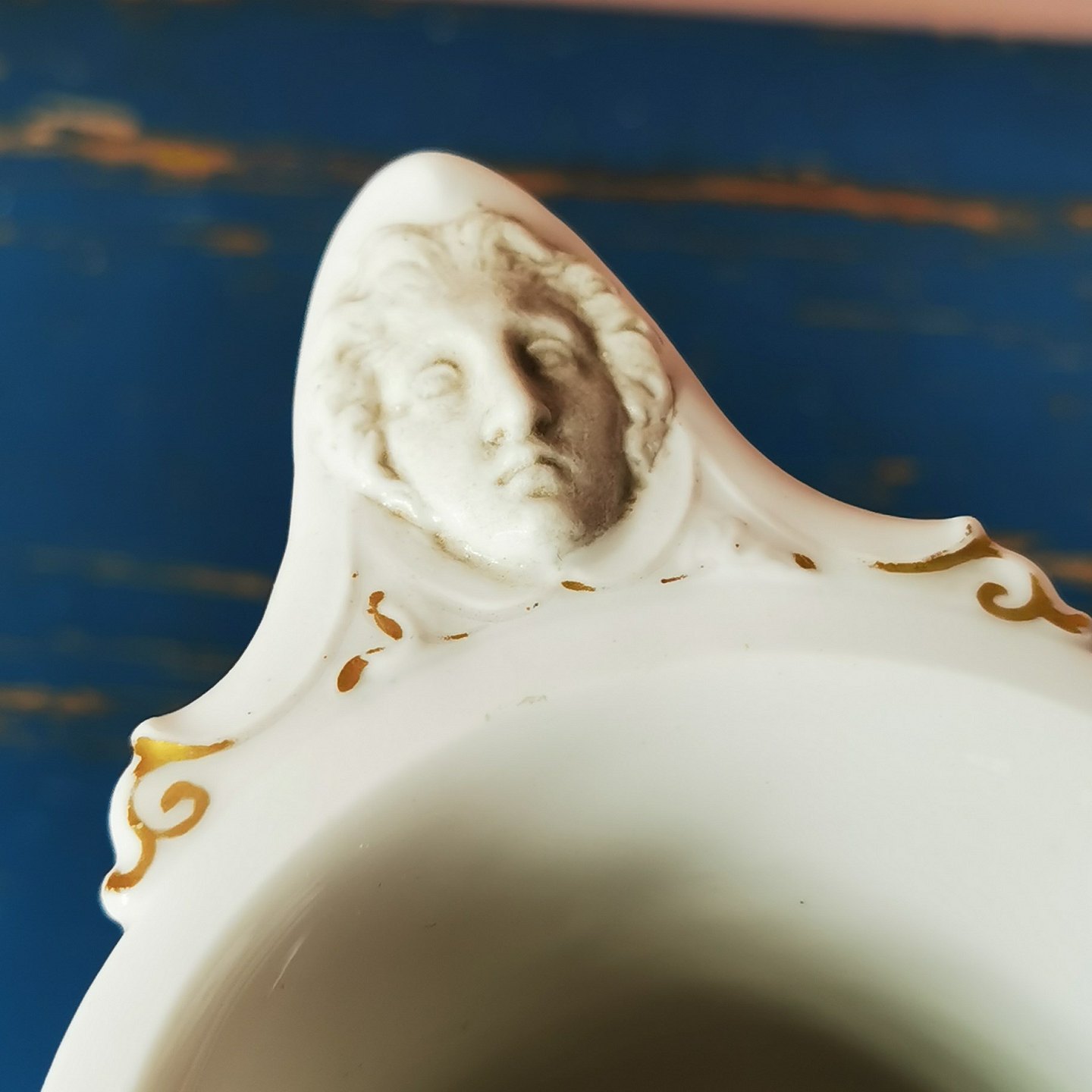 Kande i hvid porcelæn med dekoration af bisquit ansigter fra Royal Copenhagen. Fremstår i god stand uden skader eller reparationer. Fremstillet i slutningen af 19. århundrede. Fabriksmærket på bunden. H. 15 cm (5.90 tommer)