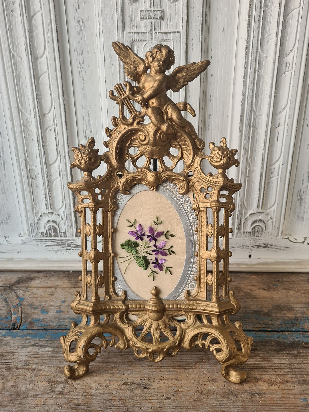Stor gammel billedramme dekoreret med en engel på toppen af rammen