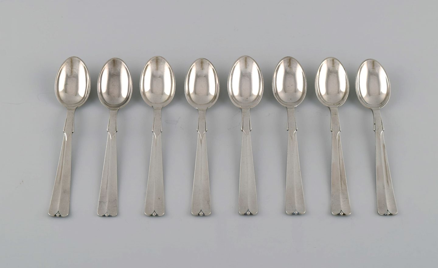 Hans Hansen sølvtøj Arvesølv nr. 7. Otte art deco teskeer i tretårnet sølv. 1930'erne.
