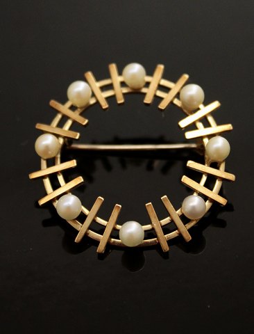 14 karat guld broche D. 3,4 cm. med ægte perler fra juveler Herman Siersbøl København emne nr. 508645