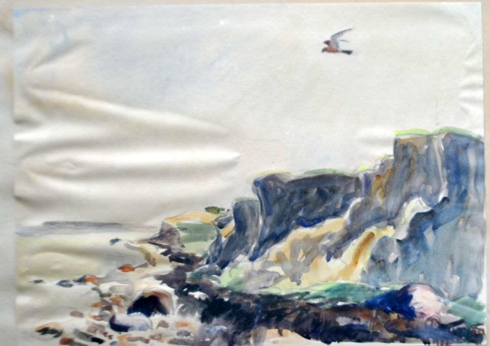 Roesgaard, Christian (20. Jahrhundert) Dänemark: Ein Raubvogel an der Küste. Aquarell. Signiert 1956. 38 x 50 cm.