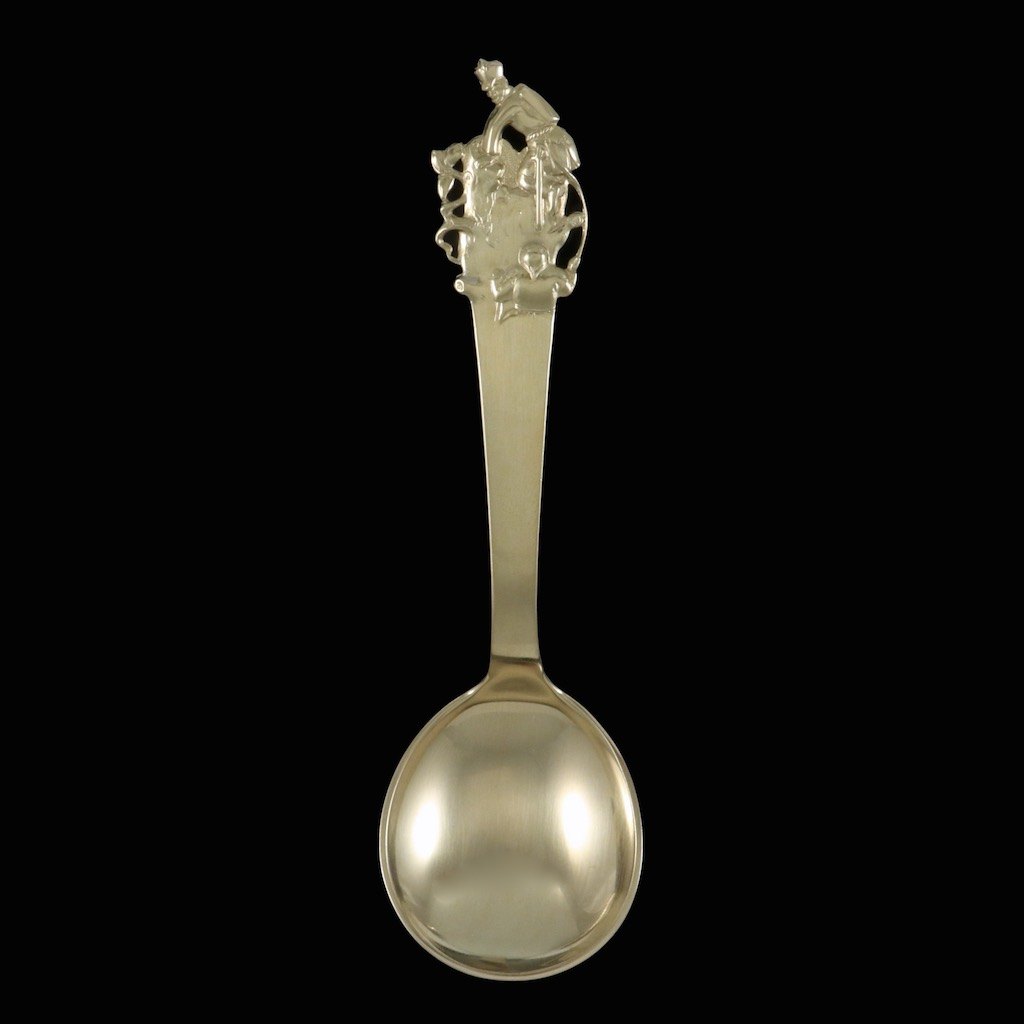 Rund barne/dessert-ske i forgyldt sølv med motiv fra H.C. Andersens eventyr.