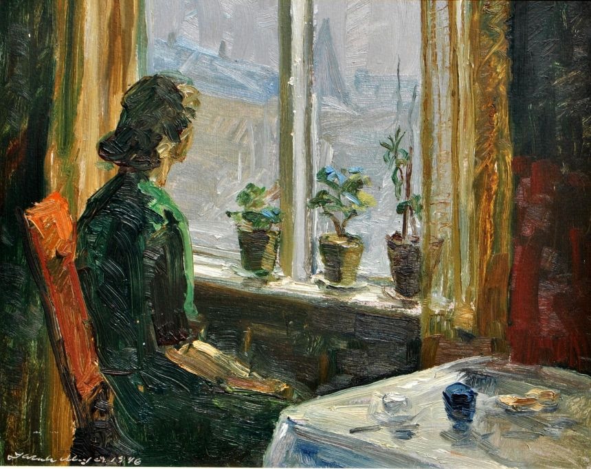 Meyer, Jacob (1895 - 1971) Danmark: En kvinde ved et vindue. Olie på lærred. Signeret 1946. 37 x 46 cm.