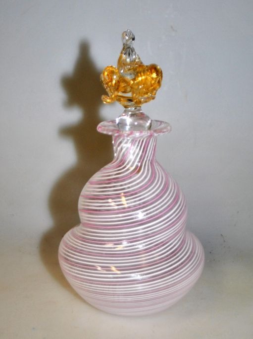 Venetiansk glas flacon, 20. årh. Italien. Flacon i klart glas med lyserøde og hvide striber. Prop i klart glas med guldstøv. H.: 14 cm.