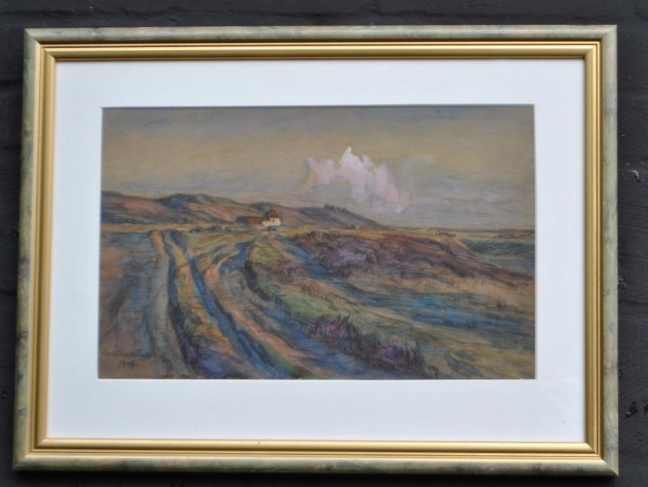 Thalbitzer, Mathilde Emilie (1874 - 1931) Dänemark: Heidelandschaft mit Haus. Aquarell. Signiert 1908. 25 x 40 cm.