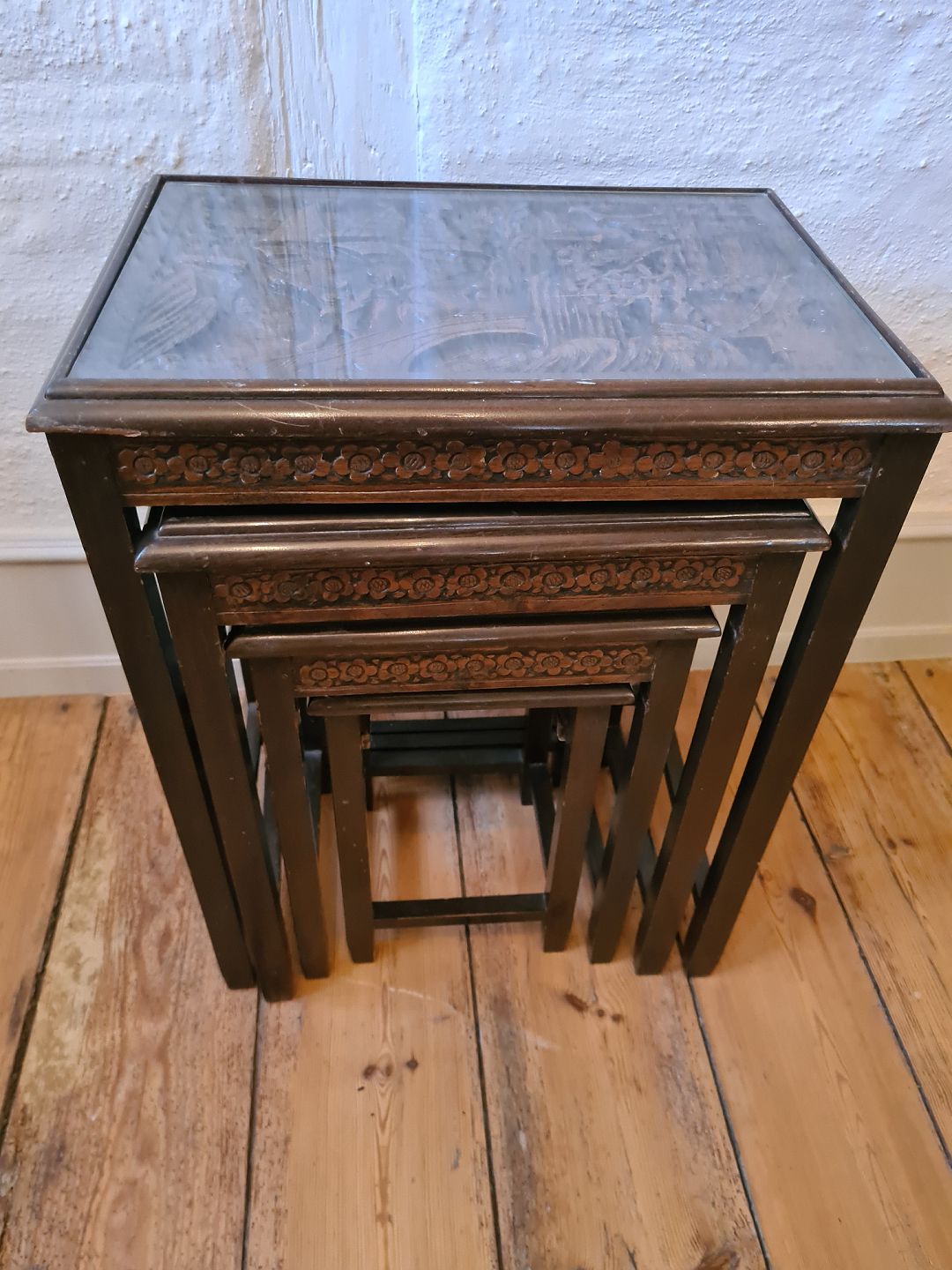 Indskudsborde i orientalsk stil med rigt udskårede bordplader og overliggende glasplader. Fremstår pæne og velholdte uden nævneværdige brugsspor.