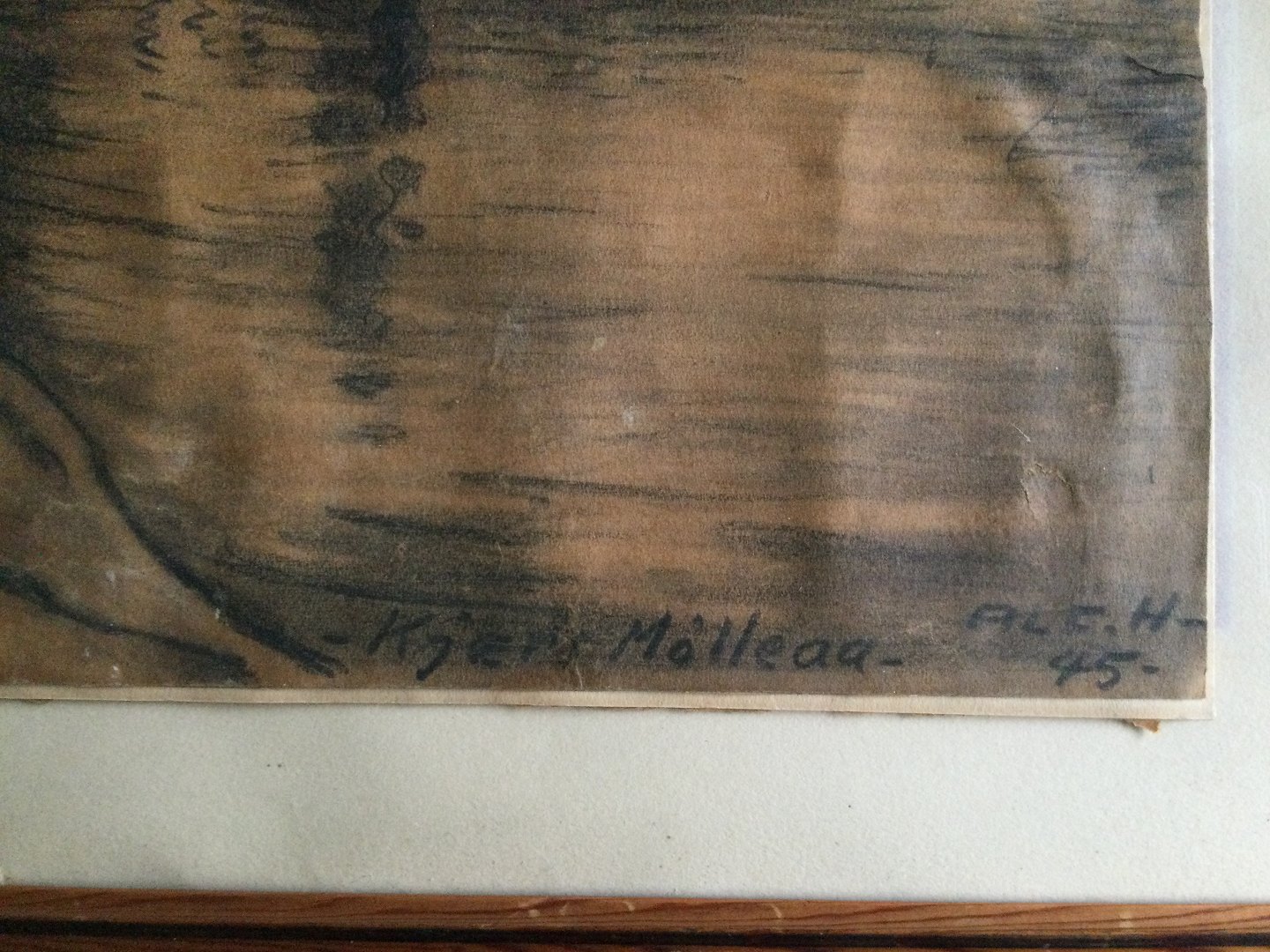 Kultegning af Alf Hansen 1945 - Parti fra Kjær Mølleå med Kjærs Mølle.