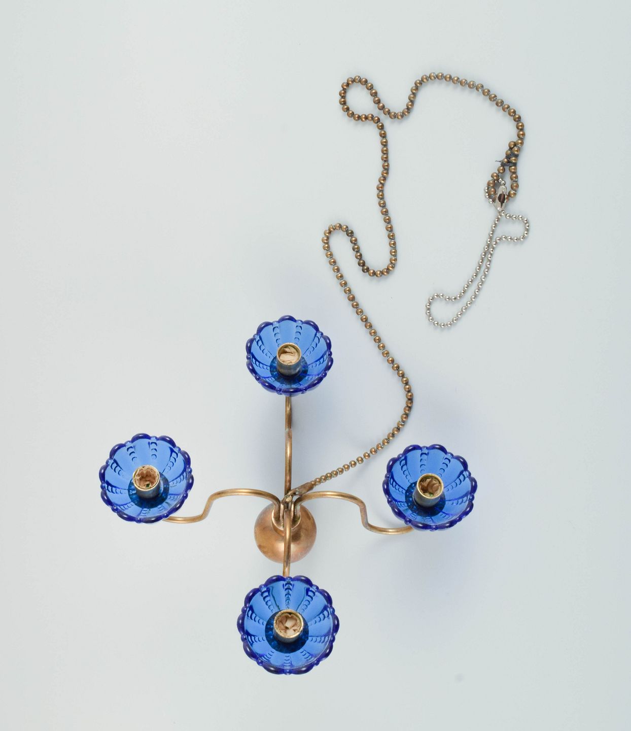 Gunnar Ander for Ystad Metall. Lysekrone til fire lys i messing og mundblæst kunstglas formet som blomster. 1950'erne.