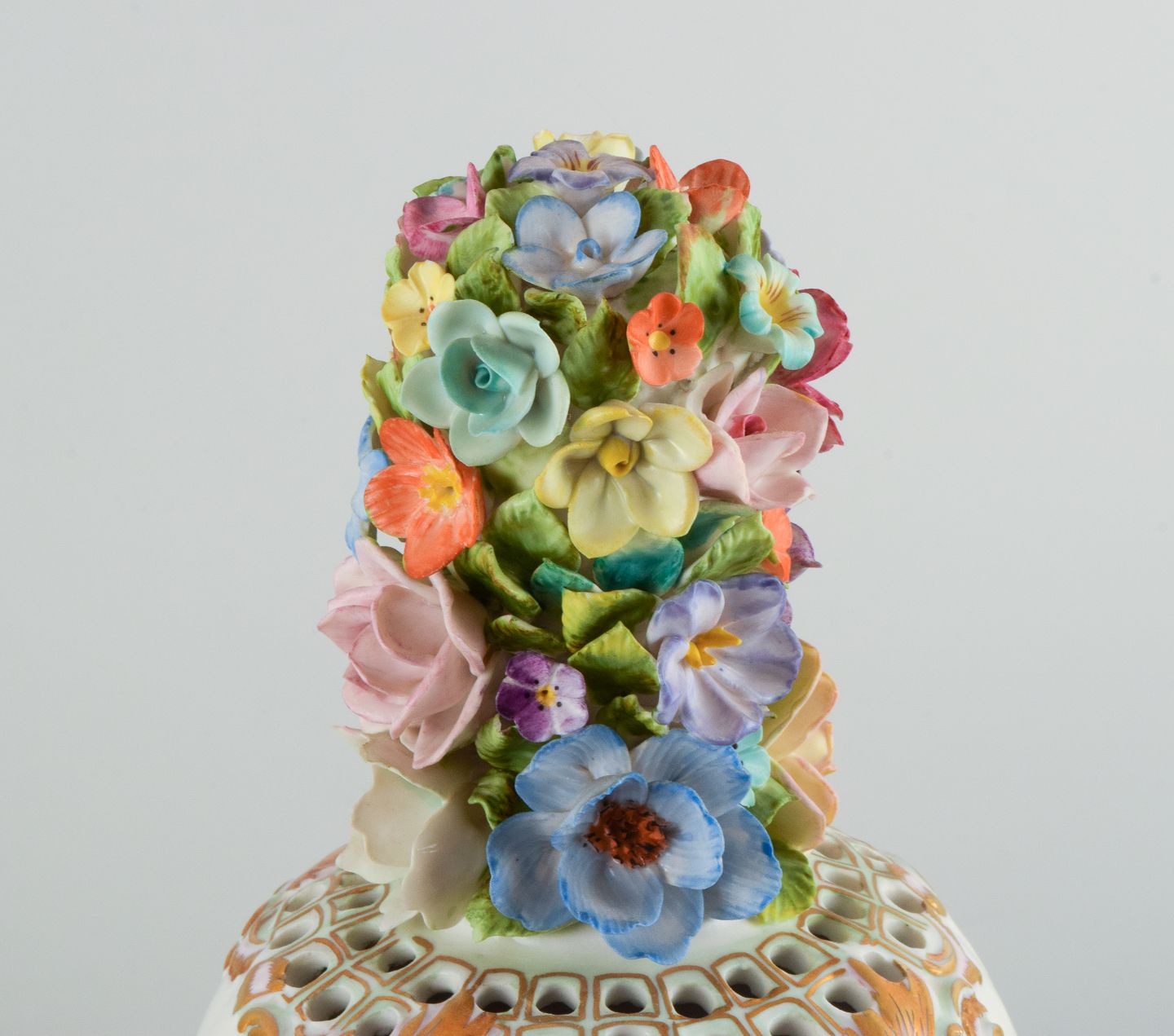 Overdådigt dekoreret med blomster i relief, håndmalet.