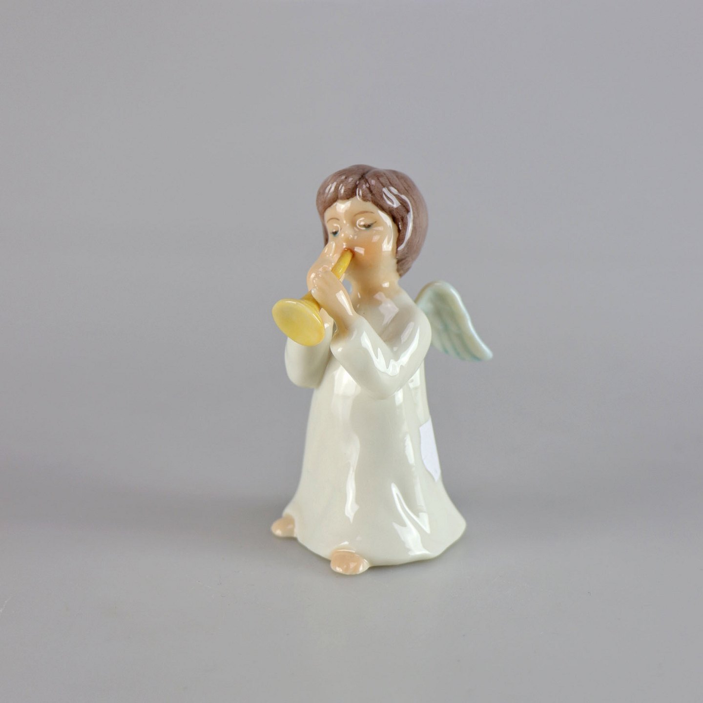 Lille porcelænsfigur med motiv af engel som spiller på trompet