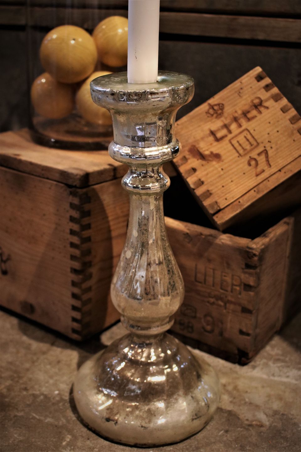 19th century candlestick in poor man's silver (Mercury Glass) with a raw patina. H:29,5cm.